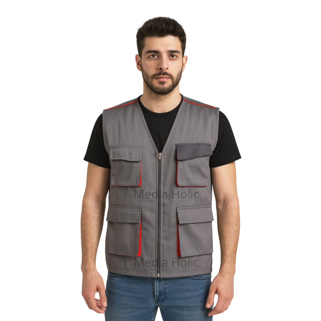 Gilet de travail multi-poches pour professionnels – Gris avec détails rouges